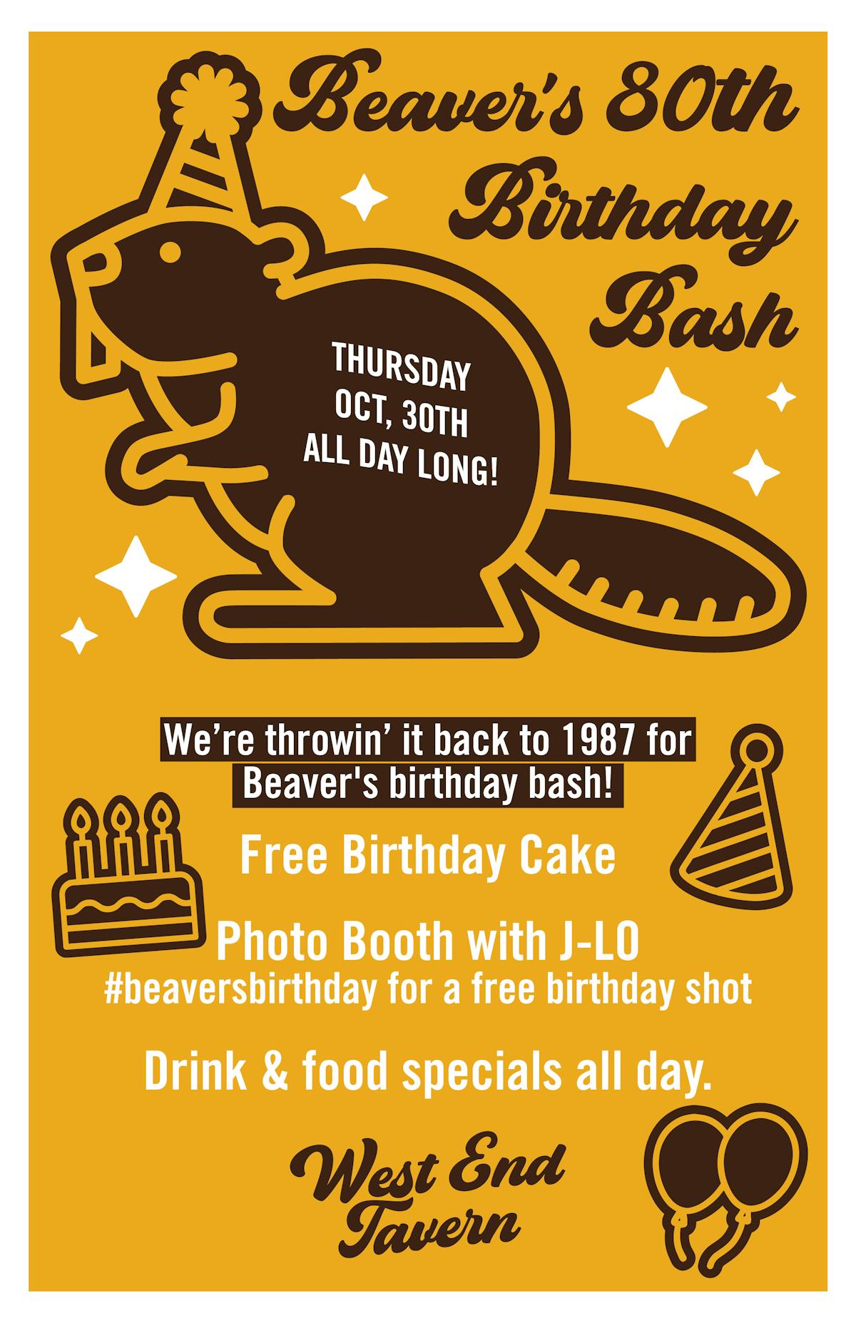 Celebrate West End Tavern's founder Steve "Beaver" Goren on Thursday October 30th. We're throwing an 80's style birthday bash complete with:
