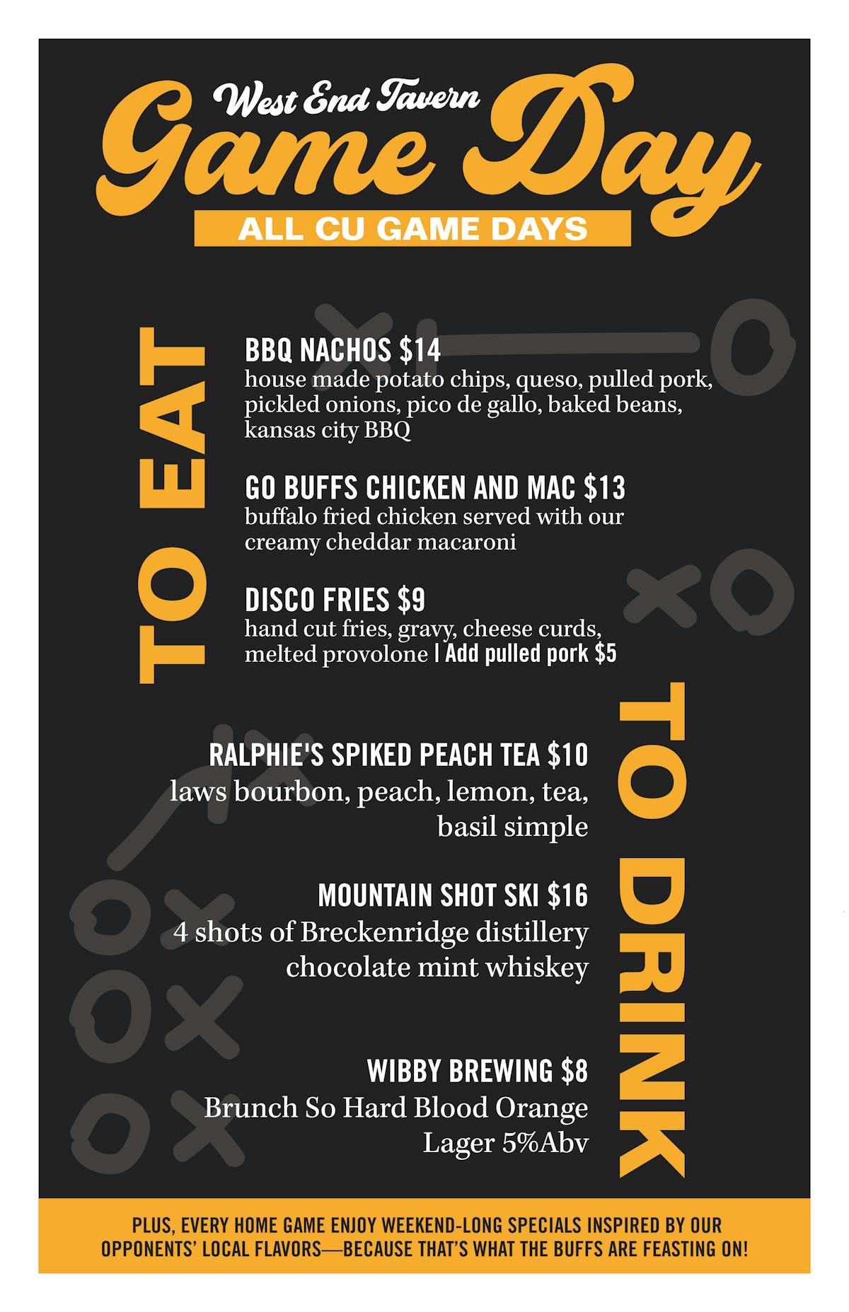Join us on Game Days for some serious CU Specials! Plus, every home game enjoy weekend-long specials inspired by our opponents local flavor — because that's what the Buffs are feasting on!
