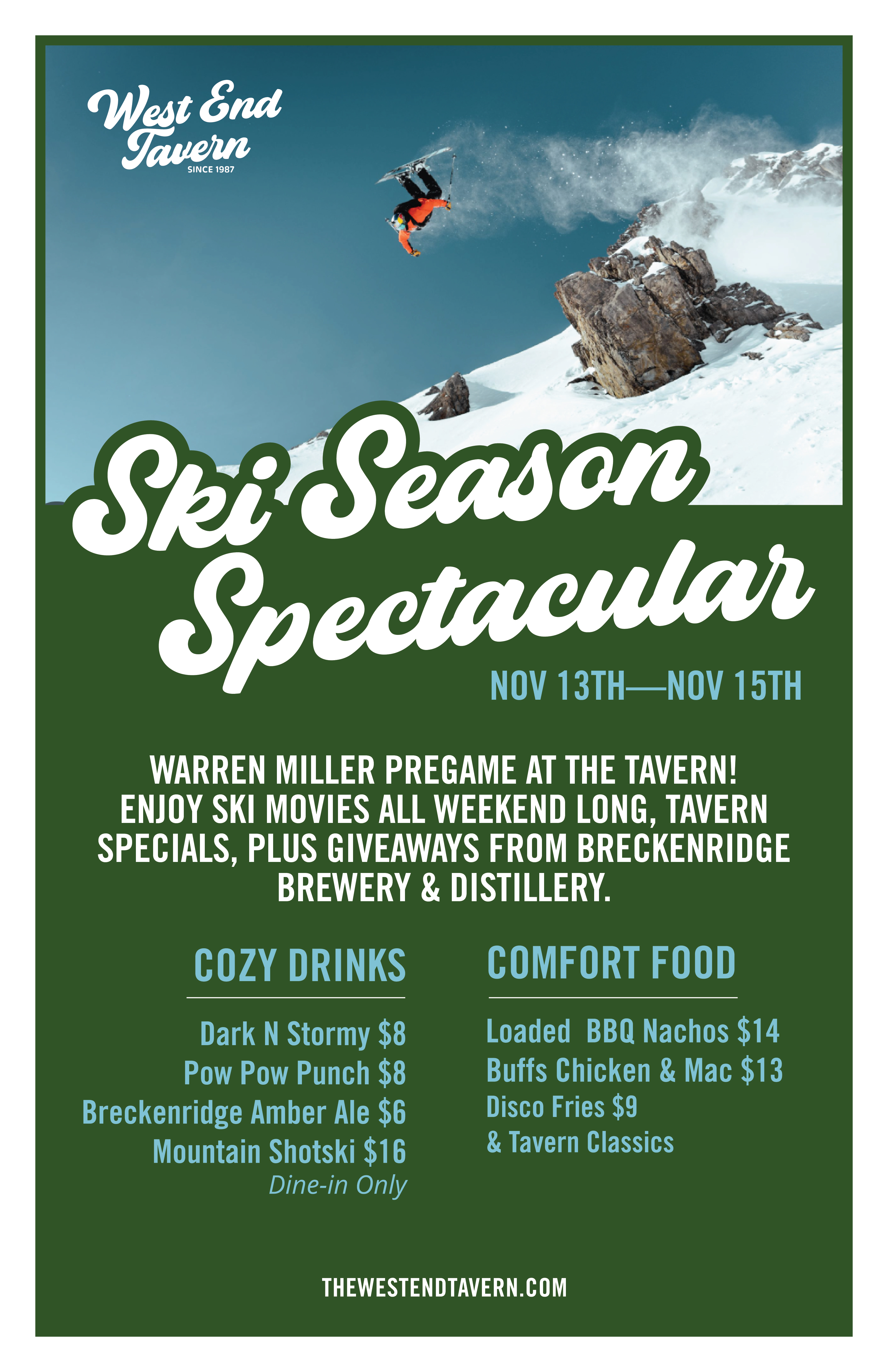 WARREN MILLER PREGAME AT THE TAVERN! ENJOY SKI MOVIES ALL WEEKEND LONG, TAVERN SPECIALS, PLUS GIVEAWAYS FROM BRECKENRIDGE BREWERY & DISTILLERY.