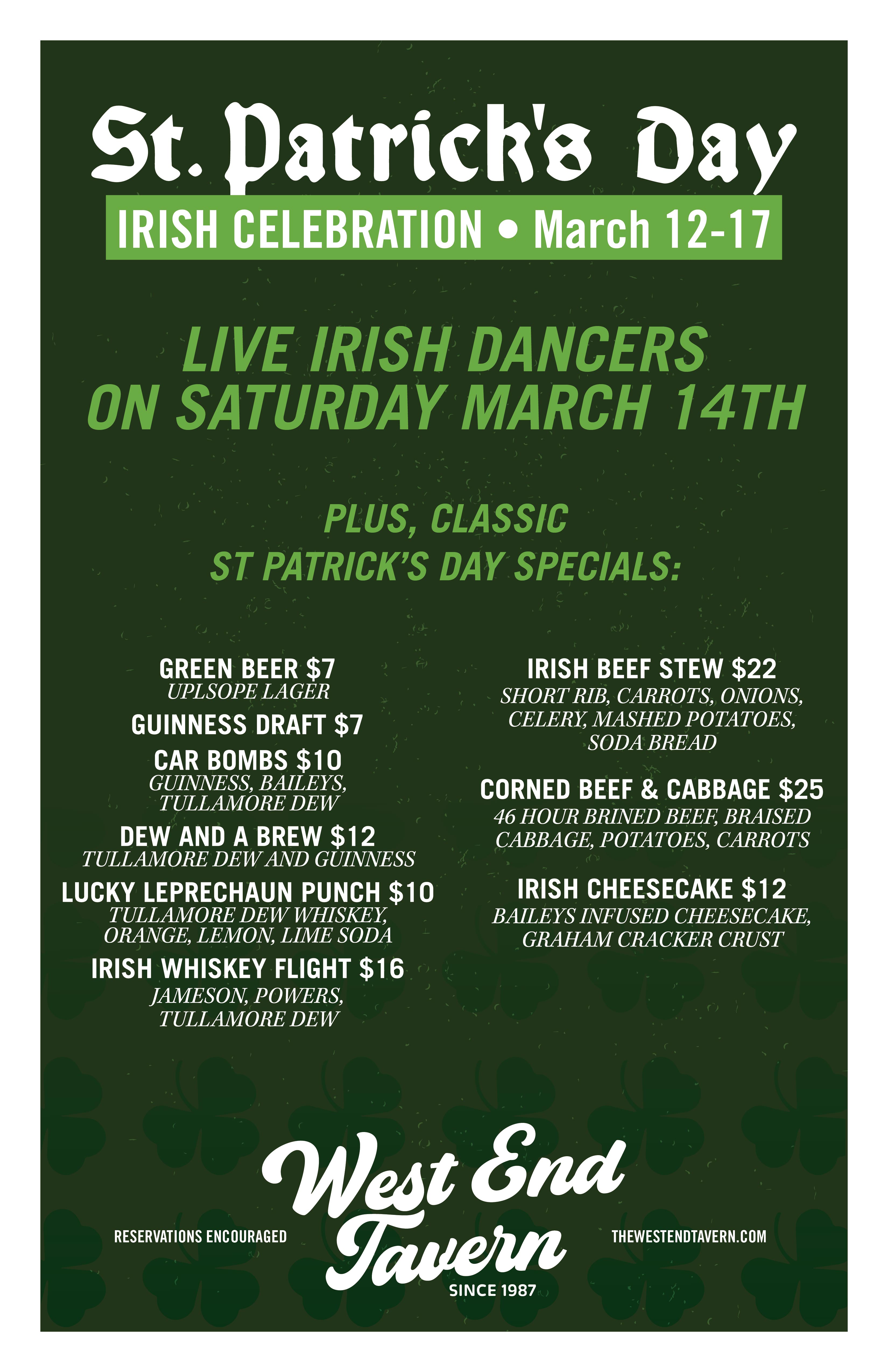 Live Irish Dancers Saturday & classic St Patrick's Day Specials all weekend long.
